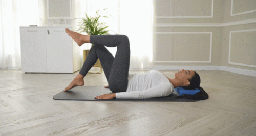 - 매트에 누운 상태에서 다리를 공중으로 들고, 무릎을 구부립니다.