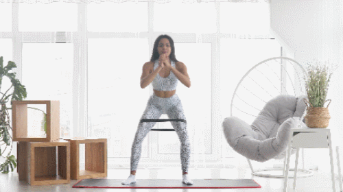 다리 사이에 밴드를 끼우고, 바닥에 서서 시작합니다. 다리를 충분히 벌려서 밴드를 타이트하게 만드세요. 그리고 스쿼트 동작 후, 오른쪽 다리를 오른쪽 방향으로 뻗어줍니다. 이번에는 스쿼트 후, 왼쪽 다리를 왼쪽으로 뻗으세요. 1분간 운동합니다.