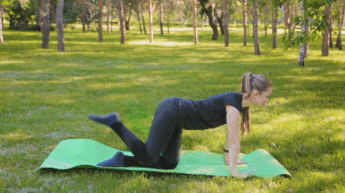 매트에 네발기기 자세로 엎드리세요. 그리고 오른쪽 다리를 공중으로 들었다가 내리는 덩키킥 동작을 진행합니다. 30초 동안 반복 후, 왼쪽 다리를 공중으로 들었다가 내리면서 30초 반복하세요.