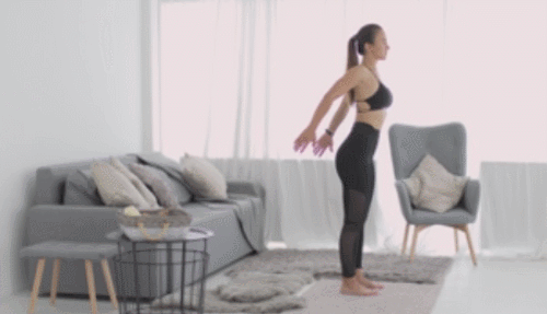 어깨너비로 다리를 벌리고 서서 시작합니다. 무릎을 살짝 구부리면서 엉덩이를 뒤로 빼고, 상체를 앞으로 숙여줍니다. 동시에 손을 머리 위로 뻗어주세요. 그리고 천천히 원래 자세로 돌아오면 되는데요. 1분 동안 진행합니다.