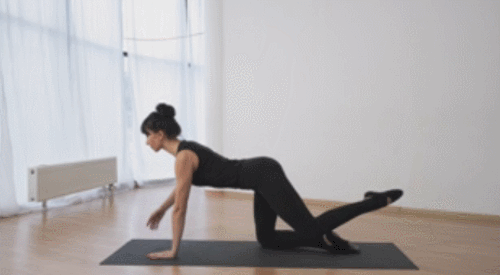 매트에 네발기기 자세로 엎드려서 준비하세요. 그리고 오른팔을 앞으로 뻗으면서 왼발을 뒤로 뻗습니다. 그런 다음 손으로 발을 잡아주는 동작을 추가하세요. 이번에는 왼팔과 오른발로 반복합니다. 자세를 유지하고 버티면서 1분간 운동하세요.