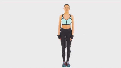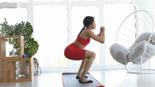 매트에 무릎을 꿇고 앉아서 시작하세요. 손에는 아령이나 생수병을 들고, 앞으로 뻗습니다. 그리고 몸을 일으키면서 스쿼트 동작으로 연결하세요. 그런 다음 다리를 매트에 대면서 원래 자세로 돌아오세요. 1분간 반복합니다.