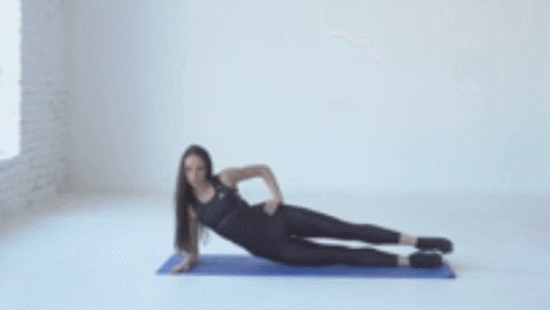 오른쪽 팔뚝으로 버티면서 옆으로 눕습니다. 그리고 왼손은 옆구리에 붙이세요. 그런 다음 왼쪽 다리를 공중으로 들었다가 내리는 사이드 레그레이즈 동작을 30초 진행합니다. 이번에는 왼쪽 팔뚝으로 지탱하고, 오른쪽 다리를 들면서 30초 운동하세요.