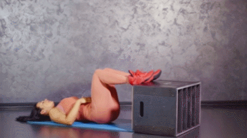 경사를 활용하여 브릿지 운동 효과를 높이세요. 바닥에 누운 후, 다리를 도구 위에 올립니다. 그리고 엉덩이를 들면서 브릿지 자세를 만들었다가 천천히 원래 자세로 돌아옵니다. 1분 동안 업다운 동작을 반복하세요.