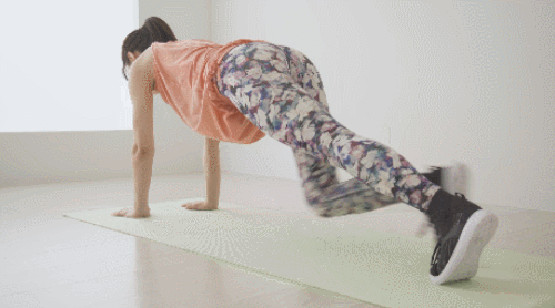플랭크 자세에서 다리를 당기는 동작을 추가하세요. 오른쪽 무릎을 당겼다가 되돌리면서 왼쪽 무릎을 당겨줍니다. 팔꿈치는 구부러지지 않도록 하고, 상체의 움직임은 최소화합니다. 1분 동안 다리를 당기면서 운동하세요.