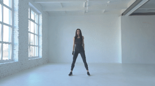 다리를 넓게 벌린 상태로 바닥에 서서 준비하세요. 와이드 스쿼트 동작을 반복하면 되는데요. 무릎을 구부리면서 엉덩이를 낮추고, 손은 가슴 앞에서 모아줍니다. 하체 곳곳을 자극하면서 1분 동안 운동하세요.