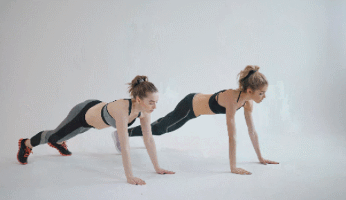 매트에 엎드려서 플랭크 자세로 시작합니다. 그리고 오른쪽 무릎을 당겼다가 되돌리면서 왼쪽 무릎을 당겨주는 동작으로 연결합니다. 다리를 번갈아 빠르게 당겨주면 되는데요. 팔꿈치는 완전히 펴고, 다리 움직임에 집중하세요. 1분간 진행합니다.