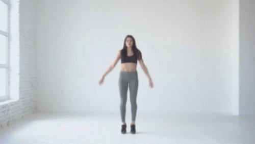 다리를 최대한 넓게 벌린 상태에서 스쿼트 동작을 시작합니다. 그리고 원래 자세로 돌아오면서 점프 동작을 추가하세요. 이때 원을 그리는 것처럼 손을 머리 위로 올렸다가 내려줍니다. 점프 동작과 함께 스쿼트 운동을 1분 동안 반복하세요.