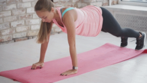 매트에 플랭크 자세로 엎드려서 준비합니다. 그리고 오른쪽 팔꿈치를 구부리고, 왼쪽 팔꿈치를 구부려서 팔꿈치 플랭크 자세로 전환하세요. 다시 팔꿈치를 펴고, 원래 자세로 돌아옵니다. 1분 동안 업다운 동작을 진행하세요.