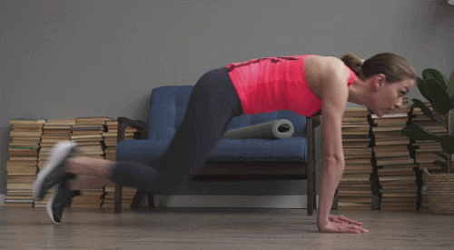 매트에 엎드려서 플랭크 기본자세를 유지하세요. 팔꿈치가 구부러지지 않도록 하고, 시선은 바닥을 응시합니다. 그리고 왼쪽 다리를 당겼다가 되돌리는 동시에 오른쪽 다리를 당기세요. 다리를 1분 동안 빠르게 교차합니다.