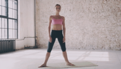 다리를 넓게 벌리고 매트에 서서 시작하세요. 발목을 바깥 방향으로 틀어줍니다. 그리고 무릎을 구부려서 스쿼트 동작으로 연결하세요. 그런 다음 옆구리를 늘여주는 동작을 추가합니다. 1분 동안 진행하세요.