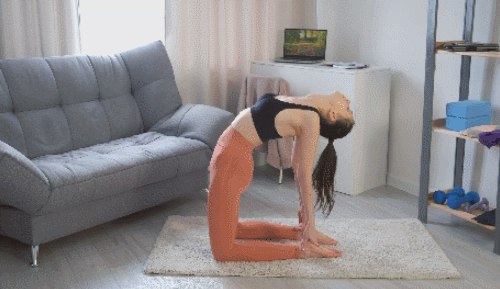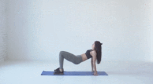 매트에 무릎을 꿇고 앉아서 준비하세요. 그리고 상체를 일으키면서 엉덩이를 들어줍니다. 그런 다음 상체를 뒤로 젖히면서 손으로 발꿈치를 잡아주세요. 이번에는 오른팔을 공중으로 들었다가 내리고, 왼팔을 들었다가 내립니다. 1분 동안 운동하세요.