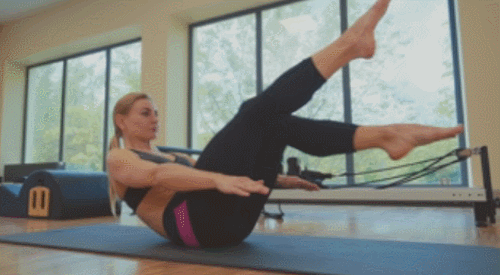 매트에 엉덩이를 대고 앉은 상태에서 상체를 뒤로 기울이고, 다리를 공중으로 뻗습니다. 그리고 복부에 힘을 주고, 자세를 유지하세요. 그런 다음 자전거를 타는 것처럼 다리를 움직입니다. 1분 동안 진행하세요.