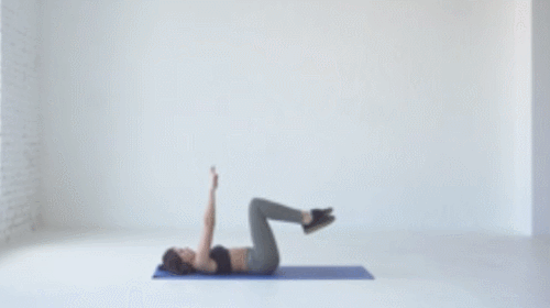 매트에 눕고, 다리를 들어서 무릎을 90도 각도로 구부립니다. 그리고 팔을 공중으로 뻗으세요. 그런 다음 상체를 일으켰다가 내리는 동작을 1분간 반복합니다. 다리가 바닥에 내려가지 않도록 주의하세요.