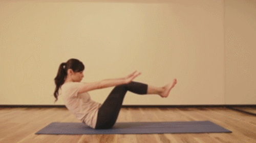 매트에 엉덩이를 앉은 후, 상체를 살짝 뒤로 젖히면서 다리들 들고, 무릎을 구부리세요. 그리고 팔을 앞으로 뻗습니다. 그런 다음 팔을 위아래로 움직이면서 호흡을 짧게 진행하세요. 1분간 운동합니다.