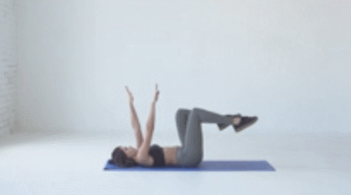 매트에 누운 상태에서 손을 공중으로 뻗고, 무릎을 들어줍니다. 그리고 왼팔을 뒤로 뻗으면서 오른쪽 다리를 내려주고, 오른팔을 뒤로 뻗으면서 왼쪽 다리를 앞으로 내려줍니다. 1분간 팔과 다리를 번갈아 움직이세요.