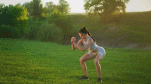 스쿼트 동작에 사이드 점프 동작을 추가하여 운동 강도를 높일 수 있는데요. 왼쪽으로 점프하면서 다리를 넓게 벌리고, 스쿼트 동작을 이어갑니다. 이때 손을 내려서 바닥을 터치하세요. 이번에는 오른쪽으로 점프하면서 반복합니다. 1분간 운동하세요.