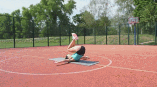 매트에 앉으면서 몸을 뒤로 누워서 다리를 공중으로 들어줍니다. 동시에 팔은 양옆으로 펼치세요. 그리고 원래 자세로 돌아오면서 몸을 일으키세요. 점프 동작을 추가할 수 있습니다. 1분 동안 구르기 변형 동작을 진행합니다.