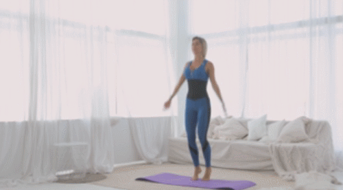 다리를 모으고 매트에 서서 준비하세요. 그리고 점프 동작과 함께 다리를 벌립니다. 동시에 손을 머리 위로 올려서 손바닥을 붙이세요. 다시 점프 동작과 함께 다리를 모으고, 손을 내려줍니다. 1분 동안 반복하세요.