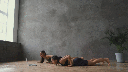 매트에 플랭크 자세로 엎드려서 준비하세요. 그리고 오른쪽 팔꿈치를 구부리고, 왼쪽 팔꿈치를 구부려서 팔꿈치 플랭크 자세로 연결하세요. 그런 다음 팔꿈치를 펴면서 원래 자세로 돌아오면, 1회가 완료됩니다. 1분 동안 운동하세요.