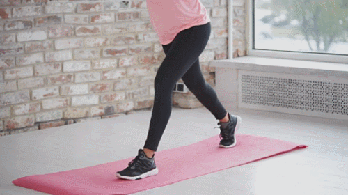매트에 다리를 모으고 선 상태에서 준비하세요. 손은 가슴 앞에서 모아줍니다. 그리고 왼쪽 다리를 앞으로 뻗고, 무릎을 90도 각도로 구부리면서 런지 동작을 진행합니다. 30초 운동 후, 오른쪽 다리를 앞으로 뻗고, 30초 반복하세요.