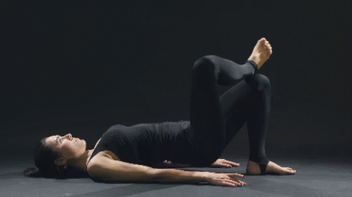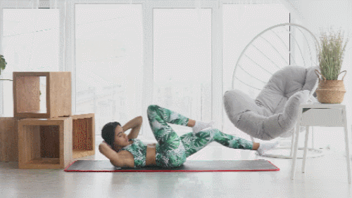 매트에 누운 상태로 손을 머리 뒤로 보내고, 깍지 껴 잡습니다. 그리고 다리를 공중으로 띄우고, 왼쪽 무릎을 당겨주세요. 동시에 상체를 틀어서 복부를 자극합니다. 이번에는 오른쪽 무릎을 당기면서 상체를 틀고 반복하세요. 1분간 운동합니다.