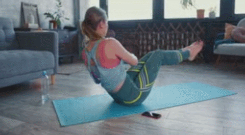 매트에 엉덩이를 대고 앉은 상태에서 상체를 뒤로 천천히 기울입니다. 그리고 다리를 공중으로 띄우고, 무릎을 살짝 구부리세요. 그런 다음 복부에 손을 모으고, 상체를 왼쪽으로 틀었다가 오른쪽으로 틀어주는 동작을 추가합니다. 1분간 운동하세요.