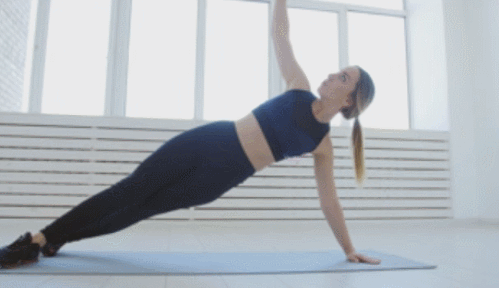 왼손을 바닥에 대고 몸을 옆으로 눕는 자세로 준비합니다. 그리고 엉덩이를 들어서 사이드 플랭크 자세를 만들고, 오른손은 공중으로 뻗습니다. 그런 다음 팔을 바닥으로 내리면서 상체를 틀었다가 올려줍니다. 30초 진행 후, 반대편 자세로 30초 반복하세요.