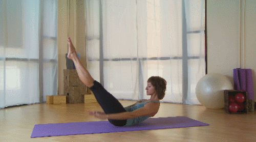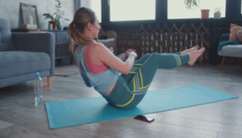 매트에 엉덩이를 대고 앉은 후, 상체를 뒤로 젖히고, 다리를 띄워서 균형을 유지합니다. 그리고 손은 복부 앞에서 모으고, 상체를 왼쪽으로 틀었다가 오른쪽으로 틀어주세요. 1분간 운동합니다.