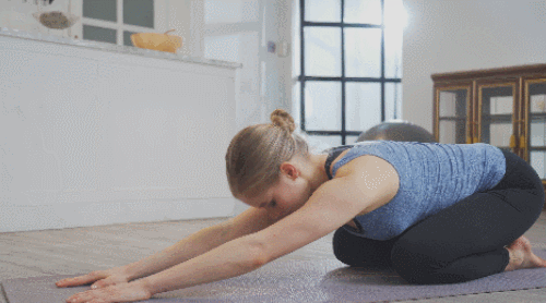 매트에 무릎을 꿇고 앉으세요. 엉덩이를 발꿈치에 완전히 붙입니다. 그리고 상체를 앞으로 숙이면서 팔을 뻗어줍니다. 이마를 바닥에 붙인다는 생각으로 스트레칭을 진행하세요. 자세를 유지하면서 호흡합니다. 1분간 운동하세요.