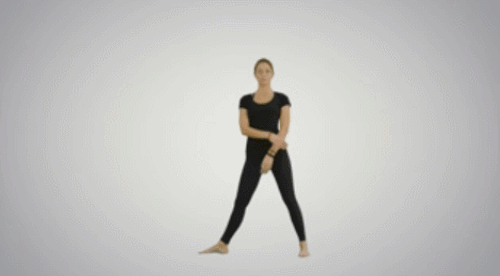 다리를 넓게 벌린 상태에서 오른쪽 발목을 오른쪽으로 틀어줍니다. 그리고 상체를 오른쪽으로 숙이면서 오른손으로 오른발을 잡고, 왼손은 공중으로 뻗습니다. 반대편 방향으로 동일하게 반복하세요. 1분간 진행합니다.