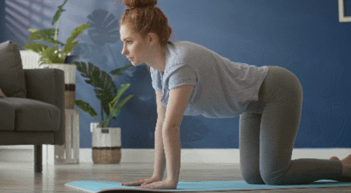 매트에 엎드려서 손과 발의 간격을 점차 좁히고, 엉덩이를 공중으로 들어줍니다. 다운도그 자세를 만들면 되는데요. 이 자세에서 무릎을 구부렸다가 펴는 동작을 추가하세요. 1분 동안 운동합니다.