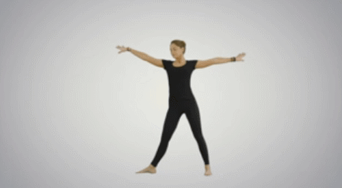 바닥에 서서 다리를 넓게 벌리세요. 그리고 오른쪽 발목을 틀어줍니다. 그런 다음 상체를 오른쪽으로 숙이면서 오른손을 바닥으로 내리고, 왼손을 공중으로 들어줍니다. 시선은 왼손 끝을 향하세요. 좌우로 움직이면서 1분간 운동합니다.