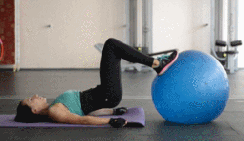 매트에 누워서 짐볼 위에 발을 올리세요. 그리고 엉덩이를 들면서 브릿지 자세를 만듭니다. 그런 다음 엉덩이가 바닥에 닿지 않도록 자세를 유지하고, 다리를 당겼다가 펴는 동작을 반복하면 되는데요. 1분 동안 운동합니다.