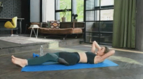 매트에 누워서 손을 머리 뒤로 보냅니다. 그리고 왼쪽 무릎을 당기면서 상체를 일으켜서 틀어주고 돌아옵니다. 이번에는 오른쪽 무릎을 당기면서 상체를 일으켜서 틀어주세요. 1분 동안 반복합니다.