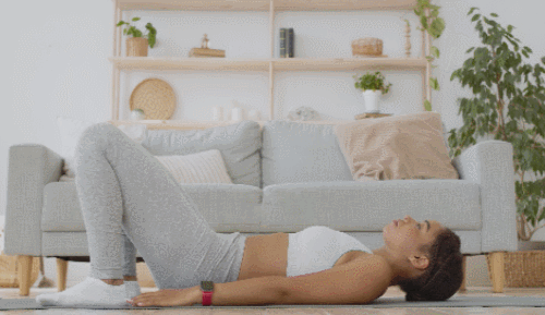 매트에 눕고, 무릎은 세우며, 발은 바닥에 고정합니다. 엉덩이를 들어서 브릿지 자세를 만드세요. 어깨부터 무릎까지 라인을 맞췄다가 천천히 원래 자세로 돌아옵니다. 엉덩이를 들었다가 내리면서 1분간 진행하세요.