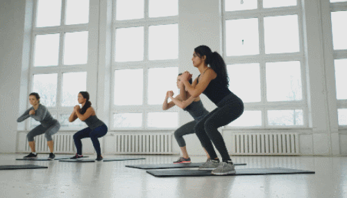 매트에 다리를 어깨너비보다 넓게 벌리고 서서 무릎을 구부립니다. 손은 가슴 앞에서 모아주세요. 그리고 의자에 앉는 것처럼 자세를 유지하면서 버티면 되는데요. 상체는 구부정하지 않도록 자세를 유지합니다. 1분간 운동하세요.