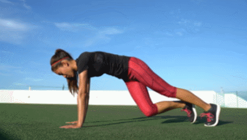 매트에 엎드린 상태로 플랭크 자세를 만듭니다. 그리고 오른쪽 무릎을 왼쪽 팔꿈치로 당겼다가 되돌리고, 왼쪽 무릎을 오른쪽 팔꿈치로 당겼다가 되돌리세요. 1분 동안 크로스 방향으로 다리를 번갈아 움직이며, 시선은 바닥을 응시합니다.