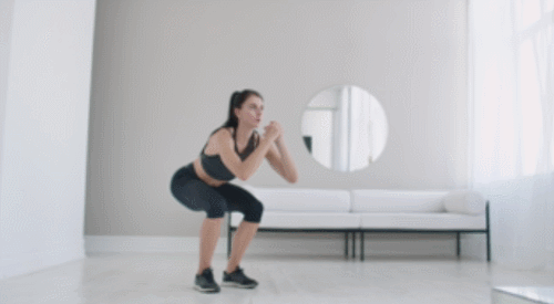 어깨너비로 다리를 벌리고 서서 손을 가슴 앞에서 모아주세요. 그리고 무릎을 구부리면서 스쿼트를 1회 합니다. 원래 자세로 돌아오면서 오른쪽 다리를 오른쪽으로 이동하고, 다시 스쿼트 동작을 진행합니다. 다리를 좌우로 움직이면서 1분간 운동하세요.