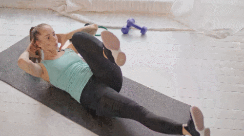 매트에 엉덩이를 대고 앉고, 상체를 뒤로 젖히면서 다리를 공중으로 띄웁니다. 무릎은 살짝 구부리세요. 그리고 손을 복부 앞에서 모아줍니다. 그런 다음 상체를 좌우로 움직이면서 1분 동안 운동하세요.